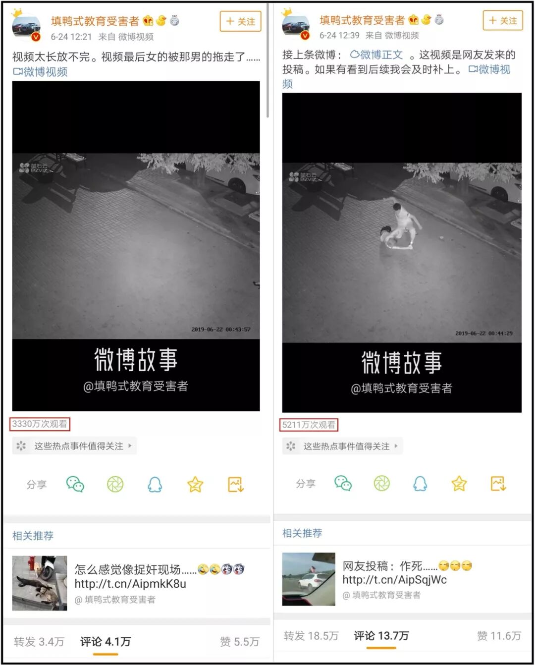 从画面水印可得知,此视频为某监控产品旗下“萤石云”监控设备所拍摄,该监控设备一般为民用,监控时间为2019年6月22日0时44分,“填鸭式教育受害者”并未在帖文中说明事发地点。视频所展现的内容涉嫌违法犯罪行为,其残暴程度,网间少见,视频发布后,网民强烈愤慨,随即引爆网络。除去网民截图、下载后转发不计,截止到6月26日19时30分,仅“填鸭式教育受害者”所发布的两条视频,总播放量就达到了惊人的8541万次,两条贴文共计被转发21.9万次、评论17.8万次、点赞17.1万次。经相关软件分析新浪微博账号“填鸭式教育受害者”的热度走势,可得知,视频的的转发、评论、点赞绝大多数是在6月24日13时-6月25日13时的24小时内所产生。