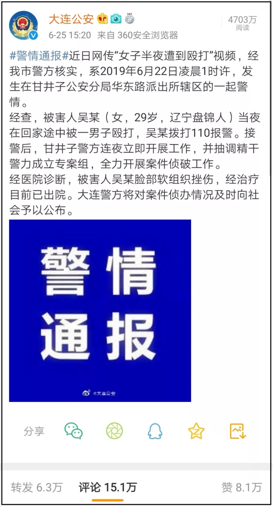 6月25日15时20分,辽宁省大连市公安局官方微博发布通报,证实“女子半夜遭殴打视频”事发地在大连市甘井子公安分局华东路派出所辖区,面对姗姗来迟的回应,除了一小部分理性网民的评论外,更多的是对大连警方铺天盖地的质问和嘲讽,质疑大连市公安局在巨大的网络声量下,明知情况却故意遮盖,并根据现场视频中男子殴打女子的暴力程度,质疑大连市公安局通报中所称女子“脸部软组织挫伤,经治疗已出院”的说法不实。