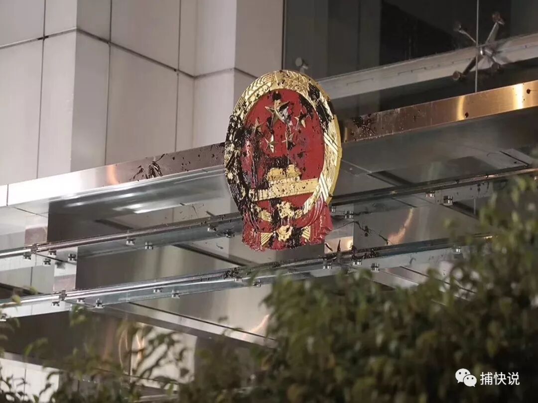 2019年7月21日下午,“港毒”暴徒在暴力游行示威后开始围攻中央人民政府驻香港特别行政区联络办公室(简称中联办)。过程中部分“港毒”暴徒向中联办入口处悬挂的国徽投掷多枚墨水弹,造成国徽污损。