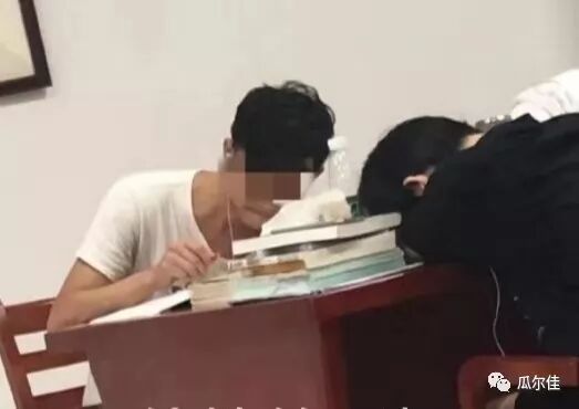 画面中有两个人物,一个是伏案苦读的男生,他对面则是伏桌睡觉的女生。单看这张照片,人们也许会有一点点感动:男生学习是刻苦的,认真的,女生可能是太累了,她要休息一下,也许她真的睡着了。