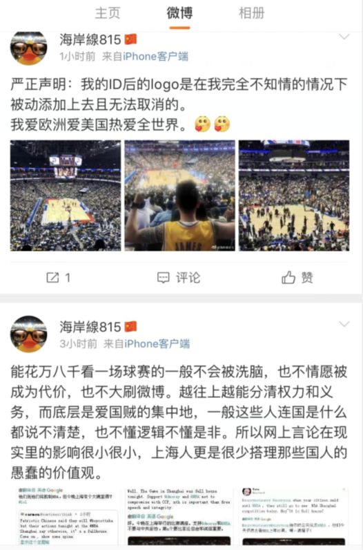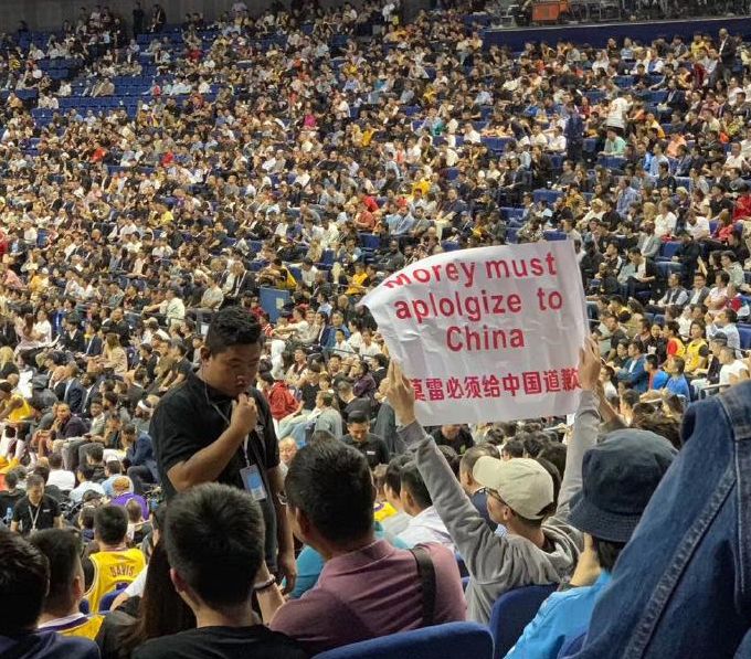 不过我们还是要提醒自己,别轻易被引导。昨晚之后随着时间拉长,更多的图片出现在网上。我们看到现场并不是一些人说的那样坐无虚席,也有很多球迷拿着条幅等等抗议莫雷,表达自己的态度等等。我在外网的朋友发现,最初的一些材料,以及在这件事里跳的最欢的,大部分是来自港台地区。美国方面对中国有不少球迷去看球这事反到没什么想法,甚至有媒体认为这是中国方面特意安排的。
