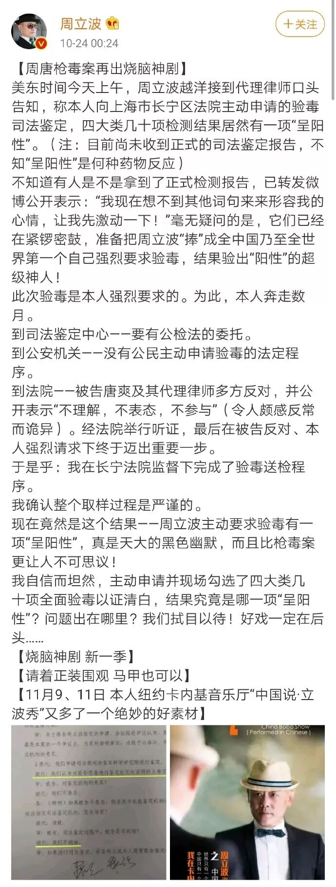 今天早上7时许,和周立波对线许久的@唐爽MIT,在微博曝光“毒检报告”,称周立波被查出“冰毒”成分。