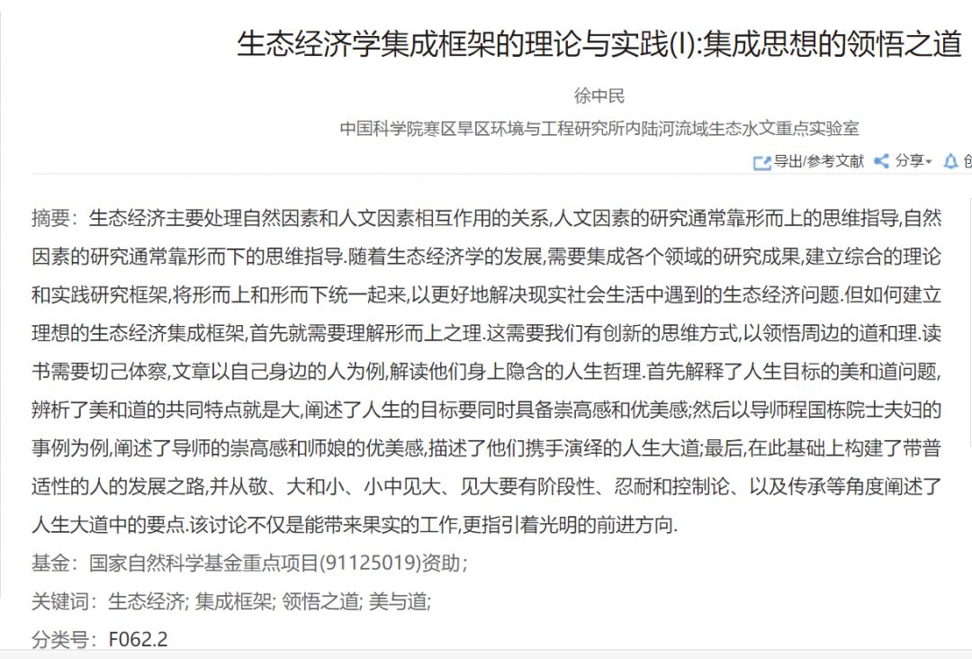 这是一篇发表在核心期刊《冰川冻土》上的论文:《生态经济学集成框架理论与实践》,全文的主旨是利用导师和师娘的事例论证生态经济理论。。。