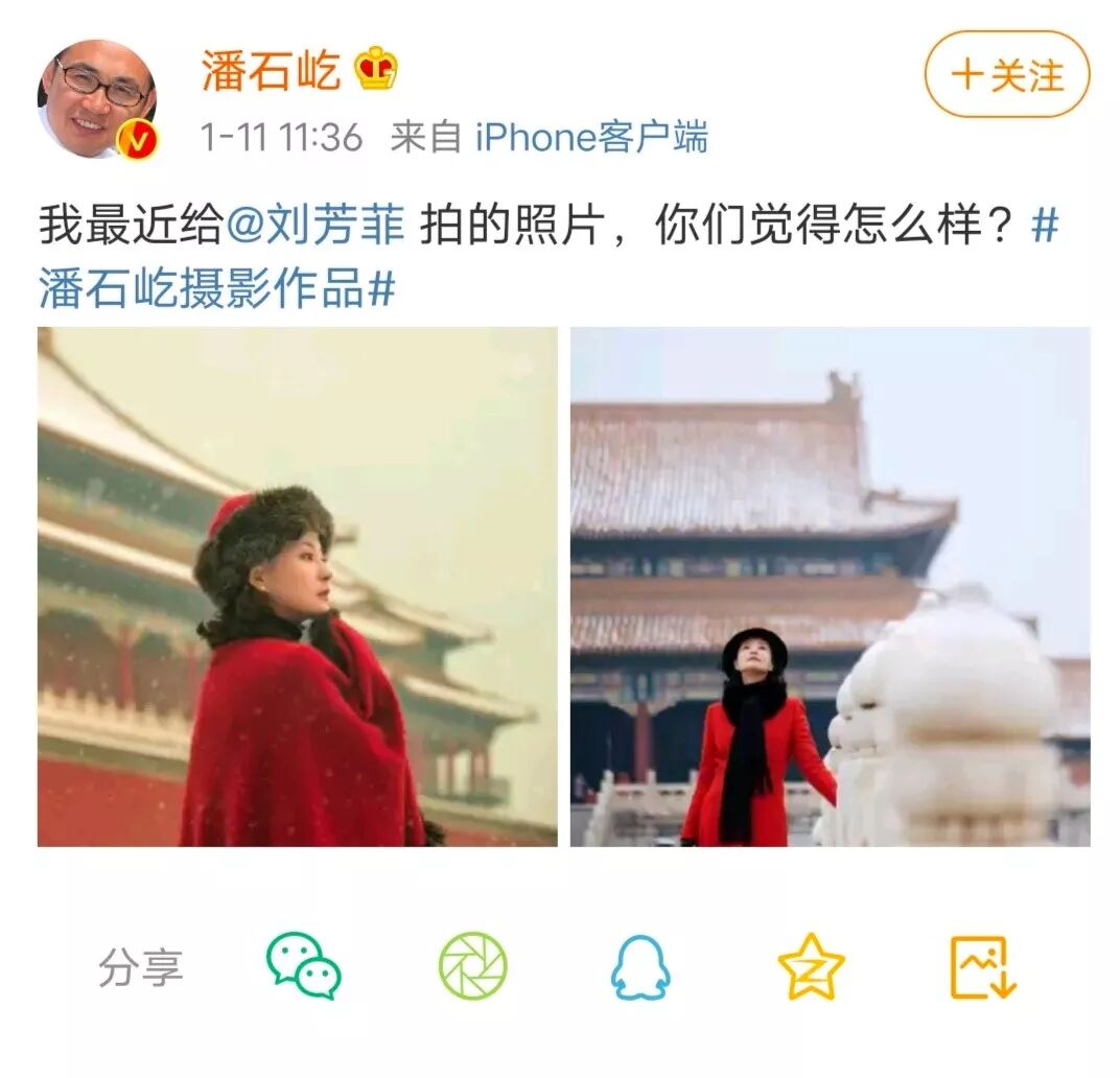当广大网友正在吃故宫大奔女的瓜的时候,潘石屹发的一条微博,也引起了广大网友的兴趣。潘石屹1月11日发微博称:我最近给刘芳菲拍的照片,你们觉得怎么样?