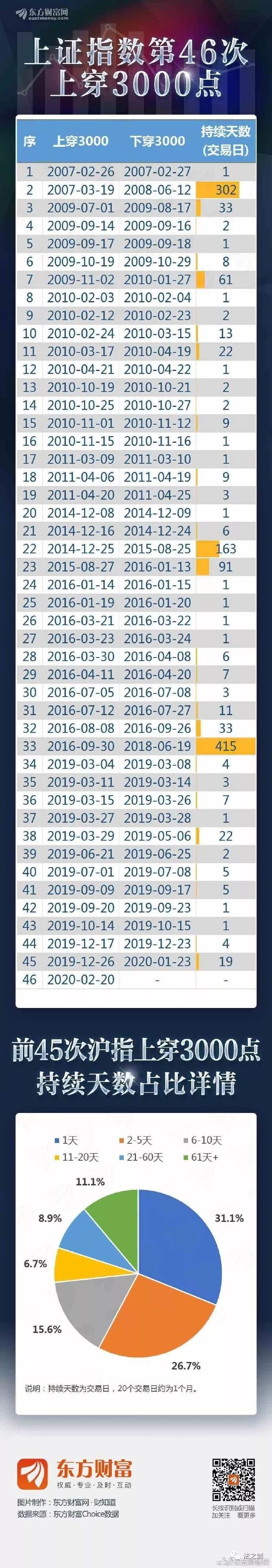 就是这张图,昨天是上证指数第46次站上3000点。2007年2月26日是第一次触及3000点,13年后的昨天上证指数再次触及3000点,13年的时间,这是第46次站上3000点。