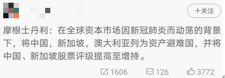 来自摩根士丹利的消息,在全球资本市场因新冠肺炎而动荡的背景下,将中国、新加坡、澳大利亚列为资产避难国,并将中国、新加坡股票评级提高至增持。