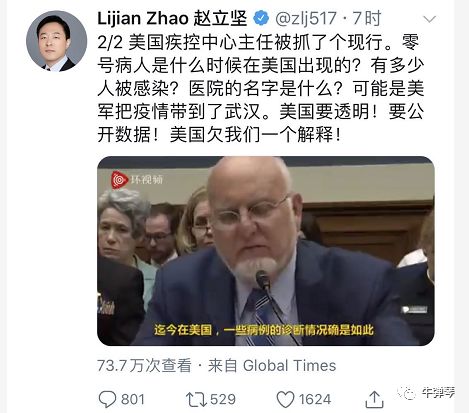 美国疾控中心主任被抓了个现行。零号病人是什么时候在美国出现的?有多少人被感染?医院的名字是什么?可能是美军把疫情带到了武汉。美国要透明!要公开数据!美国欠我们一个解释!