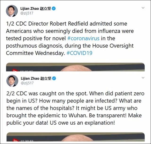 3月12日晚,外交部发言人赵立坚在推特上,用中英双语连发5条推文质问美国:“美国疾病控制与预防中心(CDC)主任罗伯特·雷德菲尔德(Robert Redfield)周三在众议院监督委员会承认,一些似乎死于流感的美国人在死后的诊断中被检测出新型冠状病毒呈阳性。”