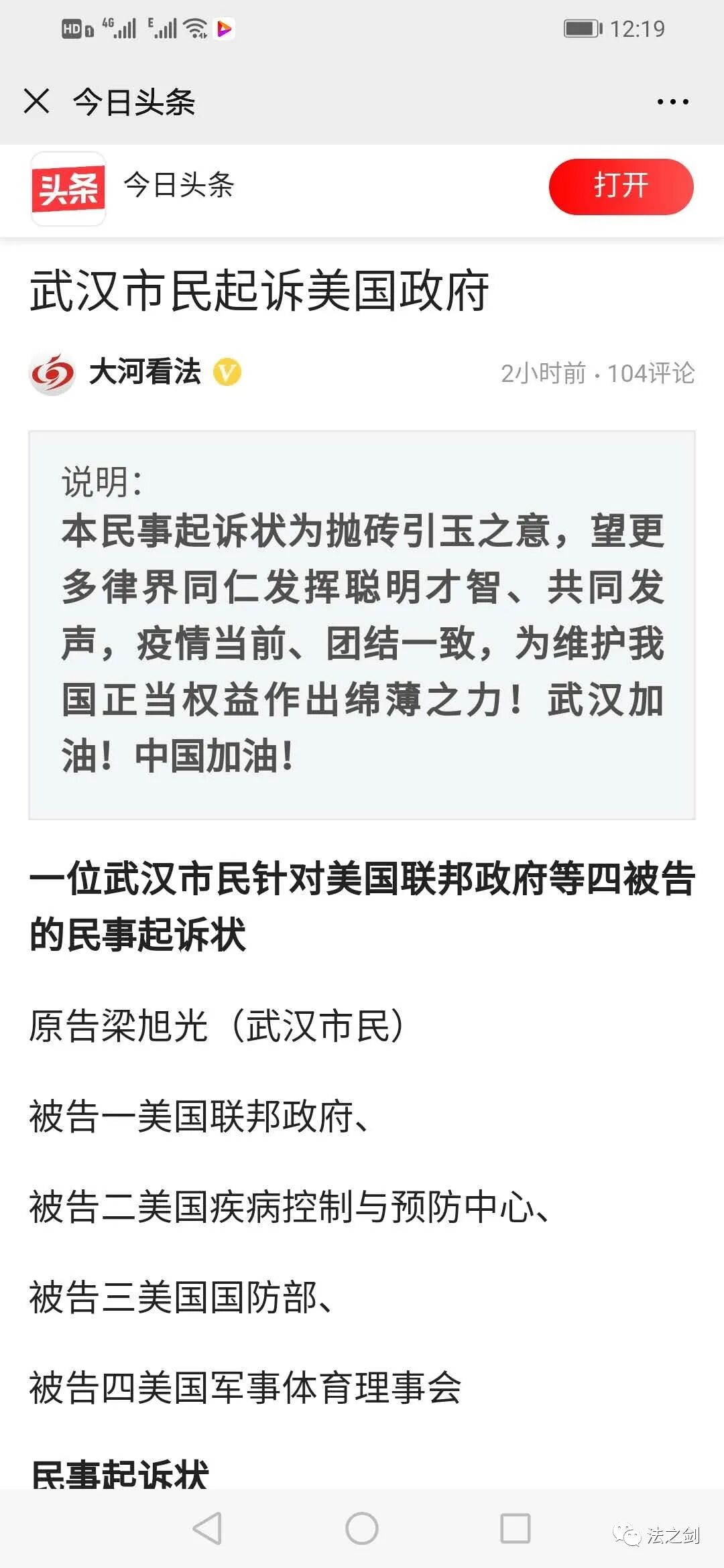 恐怕读者要说了,人家美国律师诉求数十亿美元,你这里就索赔20万人民币,这太不相称了吧?不要紧,起诉状里有这么一句话:“除原告本诉外,全体武汉新冠病毒患者及家属都将继续保留追究四被告责任的权利。”这句话挺狠。