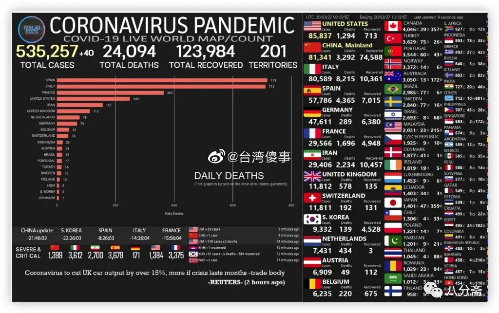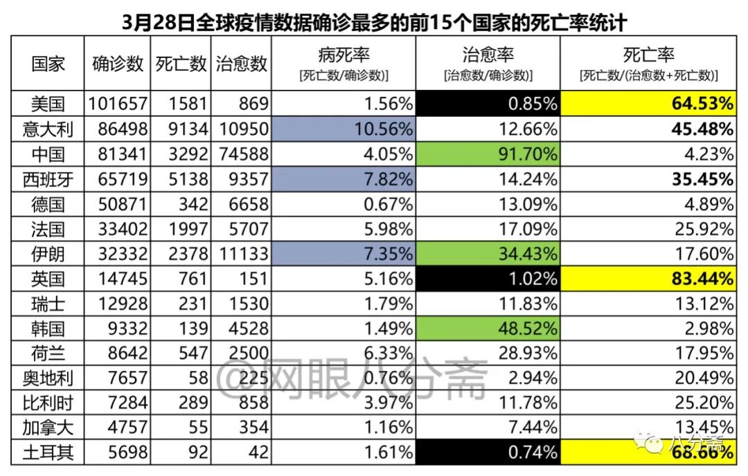 需要给大家提醒的一个问题:对于中国的死亡率,我们国内媒体报道是精准的:4.21%。对于海外各国的死亡率,则进行了模糊处理。根据2020年3月28日的海外公布的数据和死亡率的算法,我们用同样的标准看一下计算结果。
