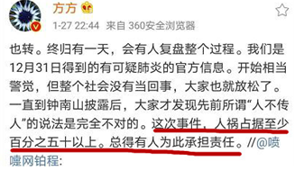 实际情况到底如何,真相总会水落石出的,一就是一,二就是二。我说这些只是想告诉方方,这么重大的事是不能凭感觉的,不是你觉得官方“隐瞒”就“隐瞒”的,你也是上网多年的人了,连“让子弹飞”四个字都没听说过?不过从方方的文字来看,方方明显早就先入为主认定武汉方面隐瞒了“人传人”真相了,否则怎么可能会在1月27日就说出“人祸占据至少百分之五十以上。总得有人为此承担责任”这样的话呢。问题还是那个问题,方方,你说“人祸”就是“人祸”?证据呢?!