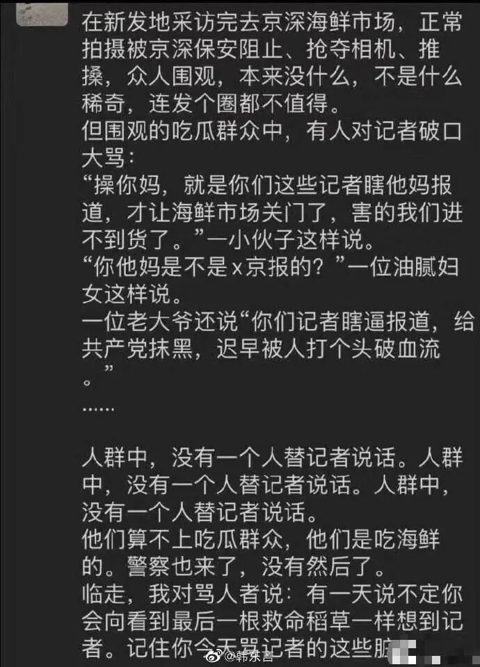 “X你妈,就是你们这些记者报道,才让海鲜市场关门了,害得我们进不到货了。”