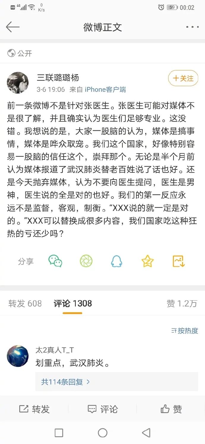 在2月12日的时候,世卫组织就把美国肺炎命名为新冠病毒,并且当时世卫组织也解释过,这么命名是根据规定,避免指代任何地点、动物和个人,避免歧视!但是,3月6日,@三联璐璐杨 还在一直坚守使用“武汉肺炎”,往小里说,三联璐璐杨不是一个合格的媒体人,根本不具备媒体人最基本的专业素质和职业道德!往大里说,当美国疯狂向中国泼脏水的时候,你还在配合美国称呼“武汉肺炎”,你究竟是中国人?还是美国人?