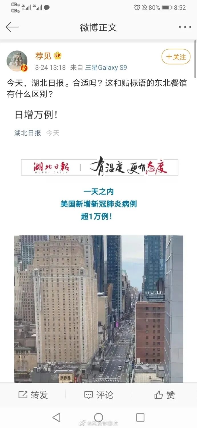 在评论三联记者为什么被打之前,我们先来回顾一下《三联生活周刊》主笔朱文轶和三联璐璐杨的屁股究竟坐在哪里?3月24日的时候,湖北日报发了一条新闻说:一天之内,美国新增新冠肺炎病例超1万例!实话实说,大部分人都会觉得湖北日报这条新闻报道没什么问题,但是,《三联生活周刊》主笔朱文轶却跳出来阴阳怪气的说:今天,湖北日报。合适吗?这和贴标语的东北餐馆有什么区别?