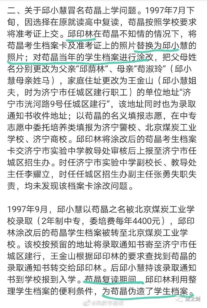 关于邱小慧,《通报》称:“邱小慧,女,汉族,1976年11月生,1991年9月至1994年6月在济宁市实验中学读高中;1997年9月至1999年6月冒用苟晶之名就读于北京煤炭工业学校。2001年4月以苟晶之名在济宁市任城区教师进修学校参加工作。”邱小慧冒用苟晶身份入学的年龄是21岁,显然其时已满足刑事责任年龄的条件了,这个无疑问。