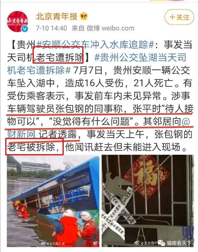 7月7日12时许,安顺发生一起公交车坠入水库事件导致包括司机在内的21人死亡、15人受伤的惨剧。7月12日,安顺警方发布了调查情况通报,对此事事件的发生经过、搜救情况、司机个人情况等进行了通报。在调查情况通报之前,有不少媒体和网民传播称张包钢是因为不满政府给他贴补拆迁款不合理,只有7万。据当地调查发现,该张只是公房承租人,也就是房子所有权是单位的,他只是房子租户,没有所有权,所以才只赔偿了7万。这个赔偿款按当地经济水平,应该是不少了。他不满的是赔的少,申请新公租房没批下来,这才怀恨在心,报复社会。猫眼看天下就奇怪了:这也能怪社会?还是自己不努力,没钱买房子,又离婚了,又没钱,生活不如意,就觉得所有人都欠他的!就算对社会不满,车上三十多个无冤无仇的无辜路人却因他死伤惨重,还有一点人性吗?某些媒体恶意炒作的所谓强拆悲剧,这些报道不会告诉你太多细节甚至对关键的事实细节故意避而不谈,而是用一二个诸如强拆等热词激化网友情绪,明显的吃人血馒头的老套路。回头来看,如果当初官方信息能早点有一说一,第一时间醒目地说明张包钢承租的是公房,政府已对其补贴7万余元,一些媒体再无良,也不会煽动如此强烈的情绪传播了,至少会对不实的信息所产生的负面舆情有一个较为明显的对冲效果。关于网传张包钢女儿因高考失利投湖自杀的调查情况。经查,张并无女儿,仅与前妻育有一子,今年25岁。网传内容为谣言,公安机关已立案调查。对于传播这种谣言者,其用心是无比险恶的,是在为凶手报复社会寻找体面甚至值得令人同情的借口:司机张包钢平时待人接物可以,没觉得有什么问题,事发当天他的老宅被拆除。这些报道不是在带节奏又是什么?他们这么做,和那个恶魔司机有什么区别?这些年来那几个令人心惊肉跳、心潮澎湃的无良媒体为凶犯洗地的手法已经是众人皆知了,而对这起案件中一些失实的报道,两者其实是异曲同工的:他从小忠厚老实、乖巧听话,邻居都夸他孝顺父母......把毫无人性的凶犯描述成一个可怜的弱势之人,把所有仇恨成功地转嫁到国家和政府身上,是那些谣媒们擅长的套路。事实上,在此事件发生后,就有了类似的新闻报道。我不禁想问问这些媒体:什么叫老宅被拆除?什么叫平时待人接物可以?你们想表达什么样的意思?![]()