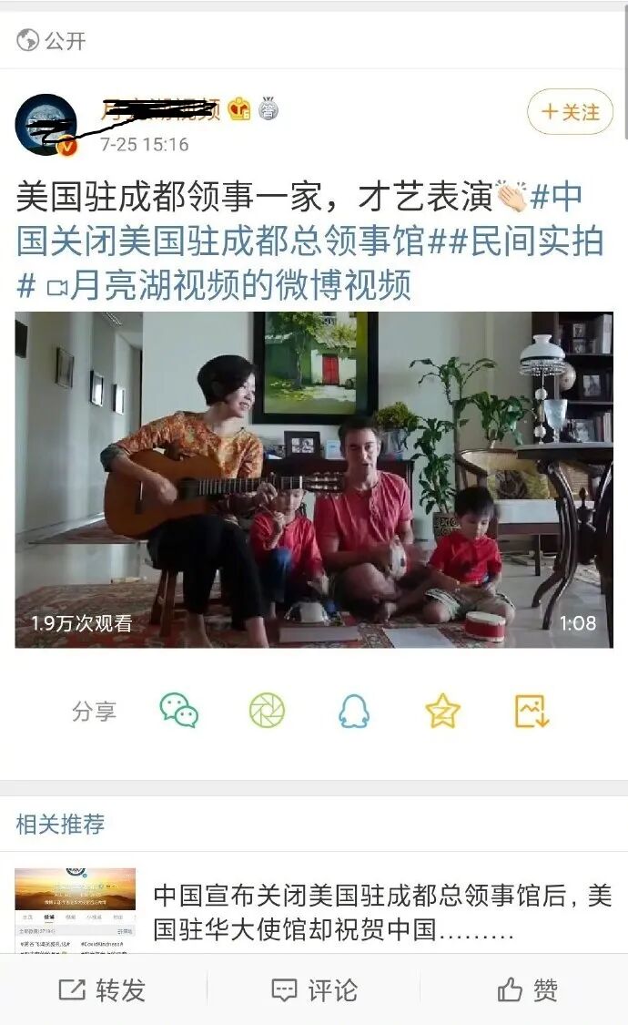 紧要关头,同时出现很多账户对美国驻成都领事馆领事夫妇集体跪舔的现象,我认为,这绝非是随性发个微博这么简单,也许背后隐藏着深不可测的东西,此点必须引起有关部门的高度重视。
