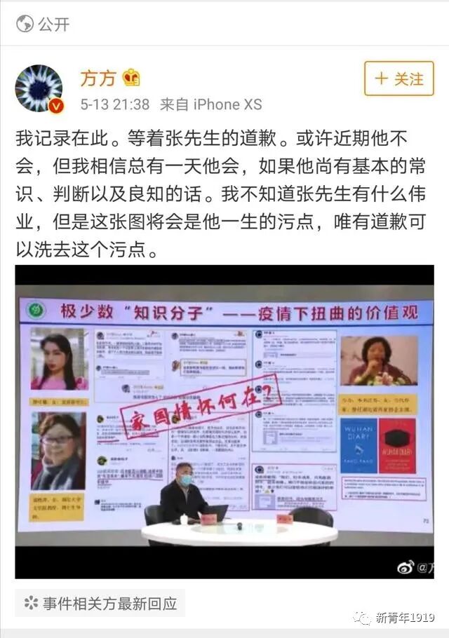 一个靠着道听途说的消息,撰写着“满地无主手机”的造谣日记,对于疫情防控非但没有贡献什么,反而在疫情防控取得重大阶段性胜利的时刻——即武汉解封的4月8日,公开在海外出版造谣日记,对于这些造谣的细节未做任何的修改和注释,就急不可耐的向外国人提供射向国人的子弹,而她,原湖北省作协主席、现中国作协会员汪芳,竟然这般赤裸裸的要求张院士向她道歉: