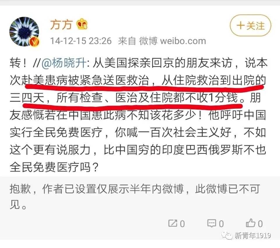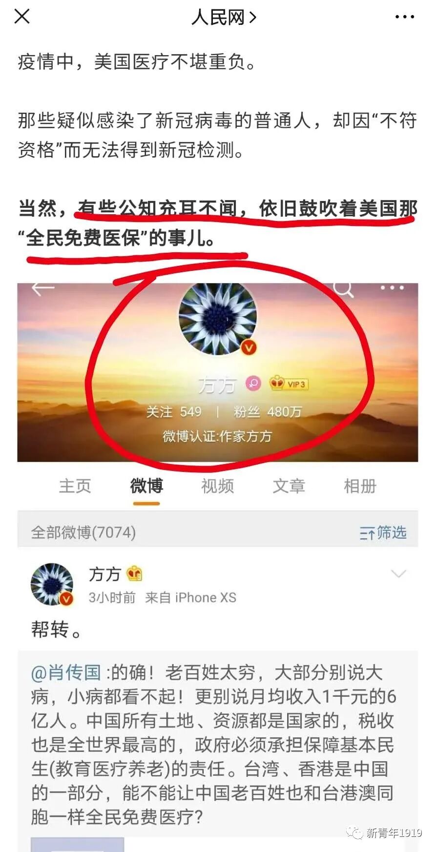 人民网竟然把方方的微博截图挂了出来、挂了出来、挂了出来,而后,用铁的事实先打左脸、接着用美国病号现身说法猛打右脸,左右脸都打肿了:
