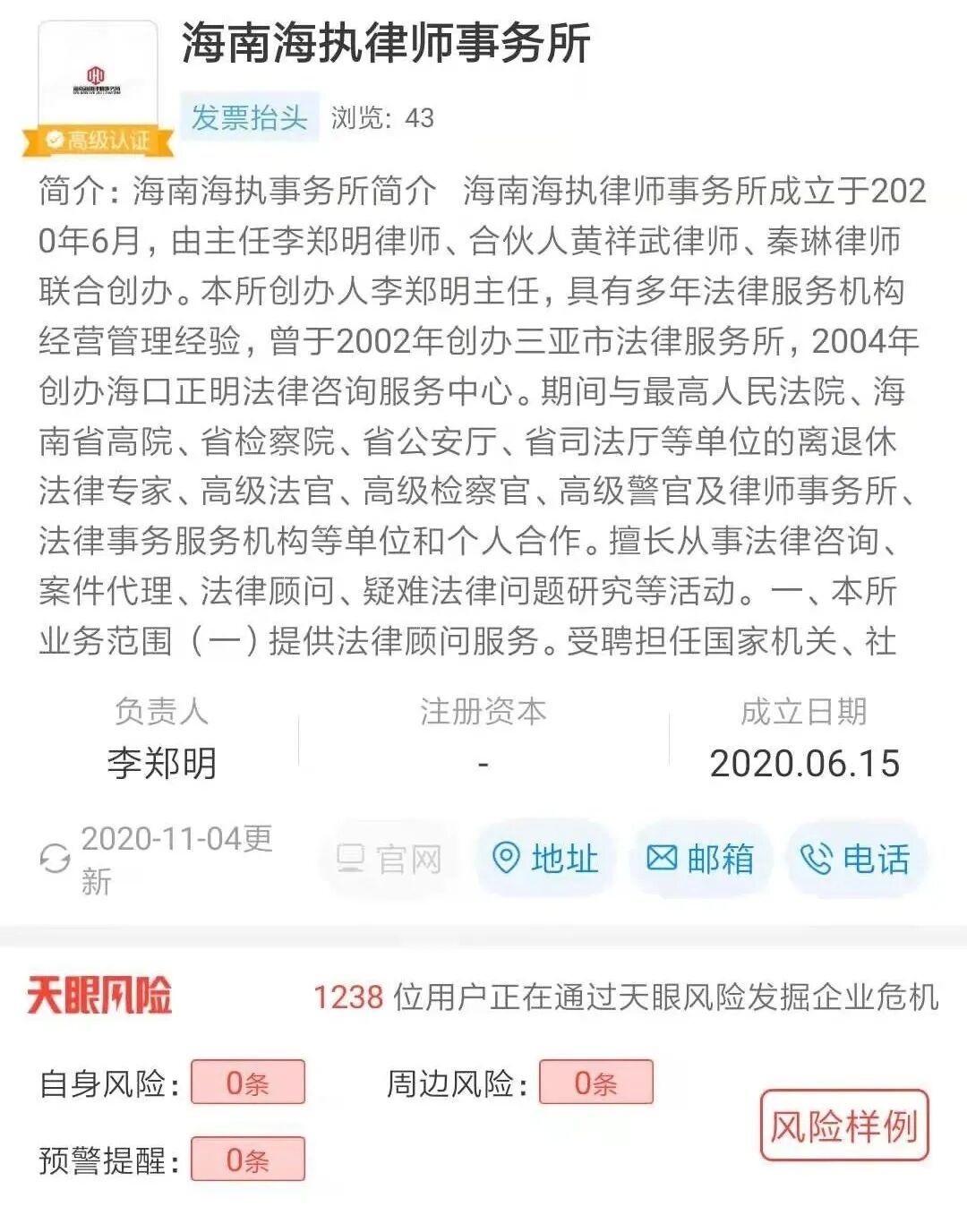 有网民立即通过天眼查到这家“海南海执律师事务所”的情况:原来这是李郑明自己给自己打印了这么一张警告海南交警的“知会书”。天才啊!