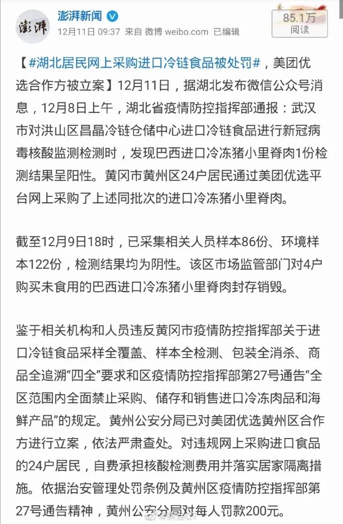 12月11日,据湖北发布消息,12月8日上午,湖北省疫情防控指挥部通报:武汉市对洪山区昌晶冷链仓储中心进口冷链食品进行新冠病毒核酸监测检测时,发现巴西进口冷冻猪小里脊肉1份检测结果呈阳性。黄冈市黄州区24户居民通过美团优选平台网上采购了上述同批次的进口冷冻猪小里脊肉。