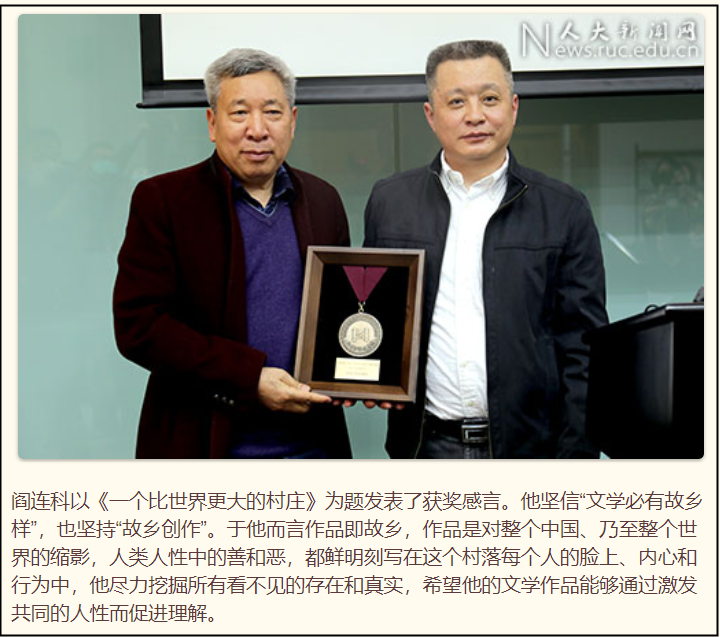阎连科先生(其实我更愿意称呼阎连科为“老阎头”或者是“阎老汉”),俺听说恁最近得了个叫“纽曼华文文学奖”的奖项,这个奖是人家美丽奸的省级大学下面的研究所搞的啥奖项,还给恁发了1万美刀,这事儿,厉害!