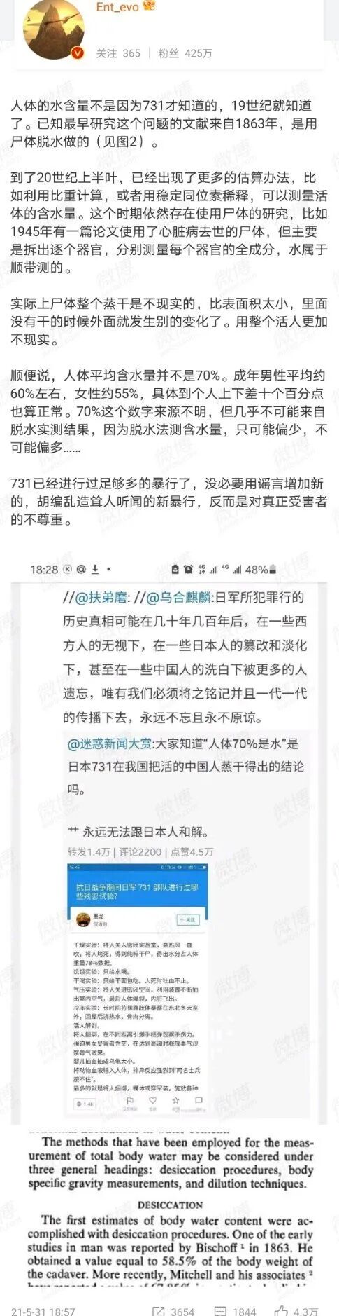 5月30日晚10时许,@迷惑新闻大赏 发了条微博,跟大家科普了下“人体70%是水的结论”是怎么得出来的。5月31日中午,@乌合麒麟 转发了此条微博,称“日军所犯罪行的历史真相可能在几十年几百年后,在一些西方人的无视下,在一些日本人的篡改和淡化下,甚至在一些中国人的洗白下被更多的人遗忘,唯有我们必须将之铭记并且一代一代的传播下去,永远不忘且永不原谅”。当日晚近9时,科学松鼠会成员@Ent_evo 就此条微博进行“辟谣”称:人体的水含量不是因为731才知道的,19世纪就知道了。已知最早研究这个问题的文献来自1863年,是用尸体脱水做的。