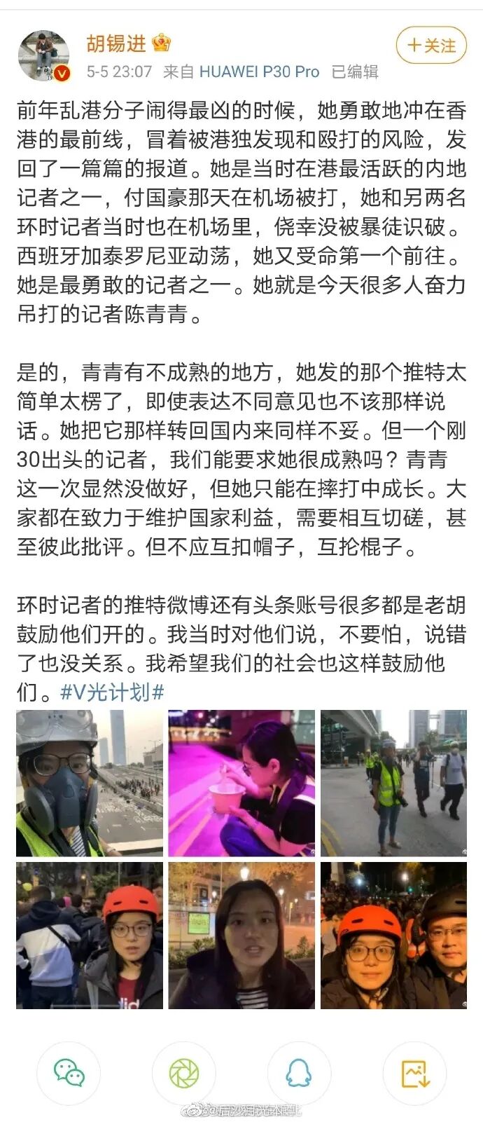 “是的,青青有不成熟的地方,她发的那个推特太简单太楞了,即使表达不同意见也不该那样说话。她把它那样转回国内来同样不妥。但一个刚30出头的记者,我们能要求她很成熟吗?青青这一次显然没做好,但她只能在摔打中成长。大家都在致力于维护国家利益,需要相互切磋,甚至彼此批评。但不应互扣帽子,互抡棍子。