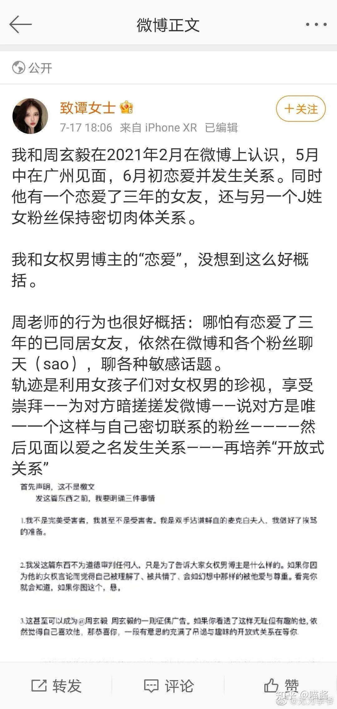 近日,一位名为“致谭女士”的网友自爆与周玄毅的交往,详细叙述了与周老师从初识到相知再到发生关系的一系列过往,内容详实到不放过任何一个细节,你甚至可以把他们的聊天记录当作“色情文学”去阅读,大家自行去找,我就不全放出来了,辣眼睛。