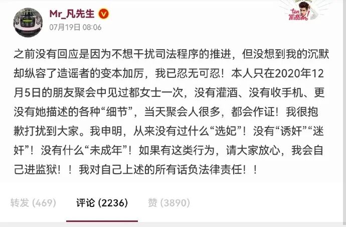 刚刚,吴亦凡就此事作出回应称,“之前没有回应是因为不想干扰司法程序的推进,但没想到我的沉默却纵容了造谣者的变本加厉”,“本人只在2020年12月5日的朋友聚会中见过都女士一次,没有灌酒、没有收手机、更没有她描述的各种“细节”,当天聚会人很多,都会作证”。不仅如此,吴亦凡还表示,“从来没有过什么“选妃”,没有“诱奸”“迷奸”!(更)没有什么“未成年”!如果有这类行为,请大家放心,我会自己进监狱!”![]()