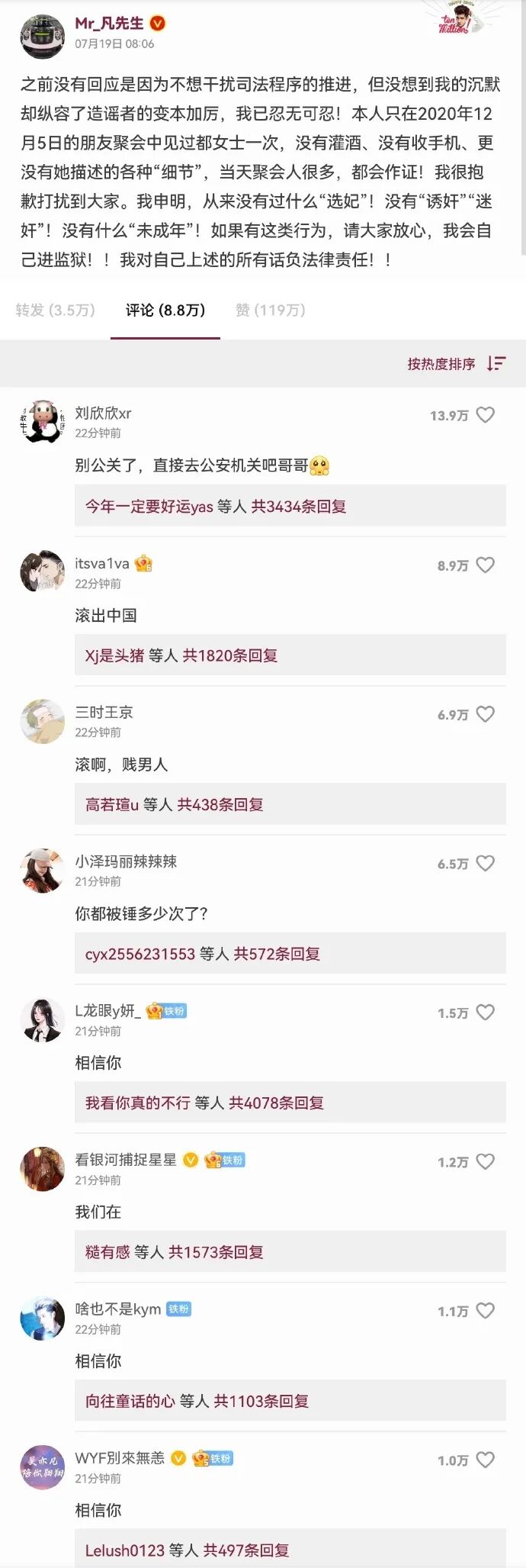 虽然有些品牌还没有发布正式声明,只是默默的设置成“仅自己可见”,但这波操作下来,吴亦凡团队已经开始怕了。我的预判是,最多再过两天,如果都美竹那时候还拿不出什么实质性的证据,证明吴亦凡确实干了她所控诉的事情,吴亦凡团队就要“铤而走险”,真的报案走程序了。但是,就算走法律途径,且如往常般取得最终胜利,吴亦凡还能像从前那般如鱼得水吗?资本从来都是逐利的,他们追求高利润,厌恶高风险,而现在乃至往后的吴亦凡,显然是颗随时就能引爆的炸弹。另外,从吴亦凡的微博评论也能看出,粉圈再行,也没法空瓶。或许风波过后,吴亦凡的粉丝还能占据主导地位,但是邪不压正,又有多少人敢自毁品牌,再请吴亦凡呢?