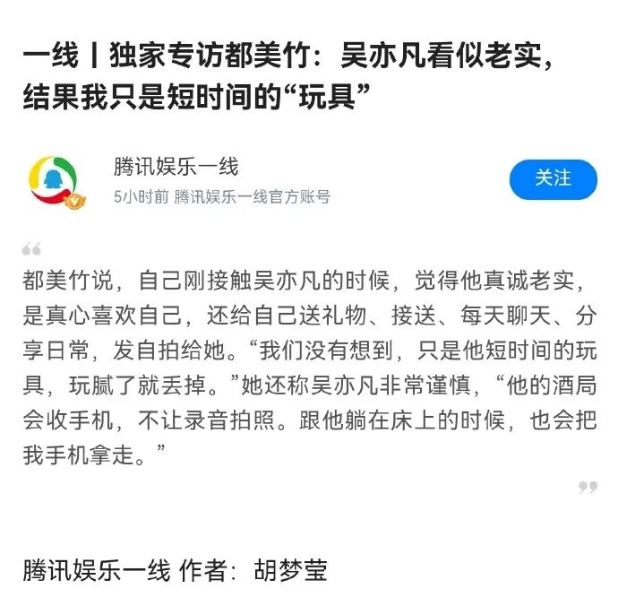 我的判断是,虽然都美竹在各种场合都不断暗示自己有证据,但她很有可能没有。毕竟,在接受媒体一线采访的时候,都美竹就说过,吴亦凡非常谨慎,“他的酒局会收手机,不让录音拍照,跟他躺在床上的时候,也会把手机收走”。![]()