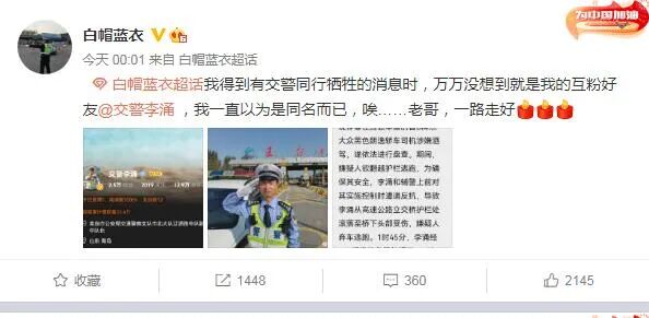 白帽蓝衣:我得到有交警同行牺牲的消息时,万万没想到就是我的互粉好友@交警李涌 ,我一直以为是同名而已,唉……老哥,一路走好。