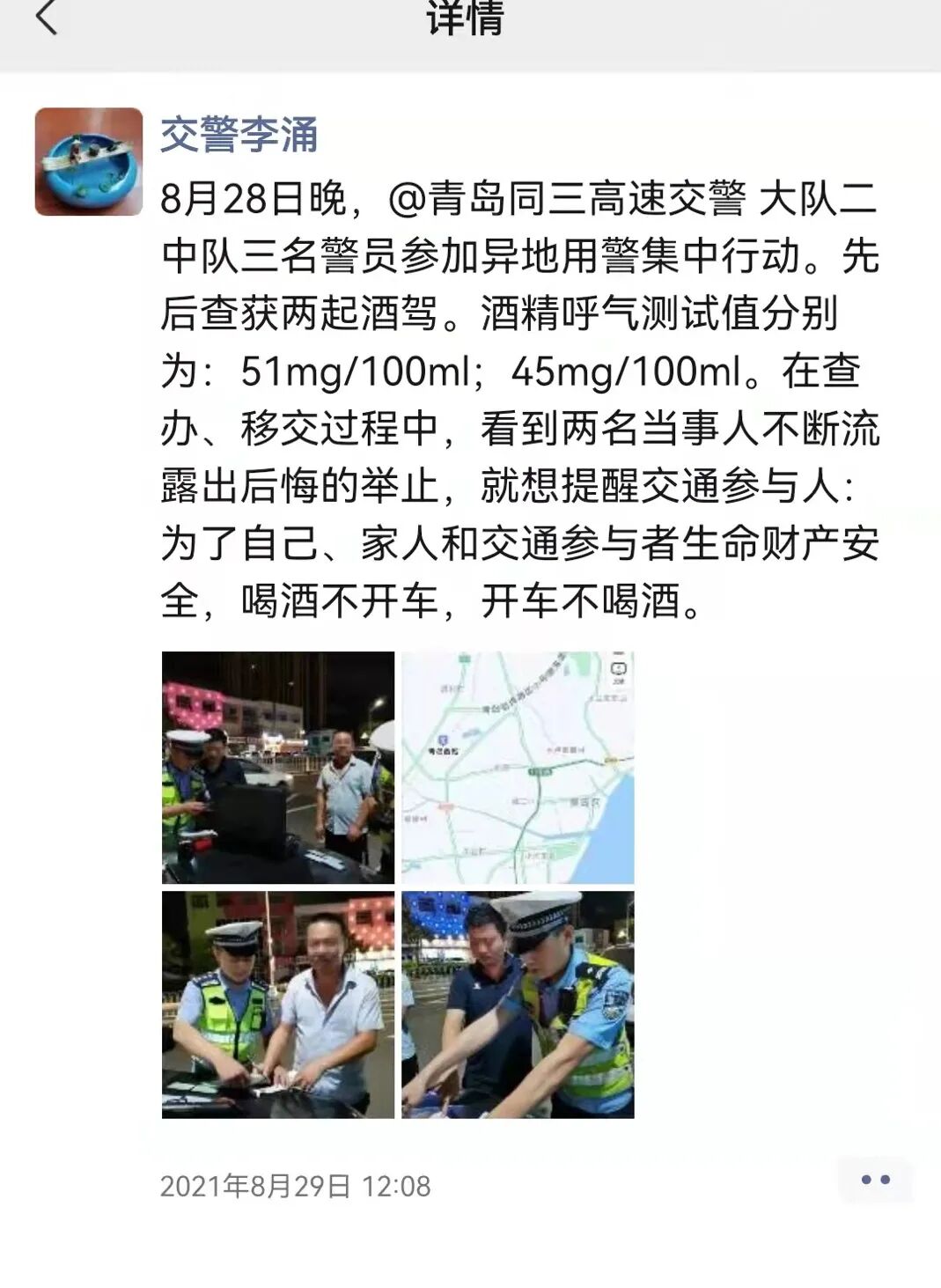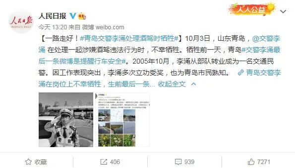 人民日报也报道了交警李涌的牺牲情况:10月3日,山东青岛,@交警李涌 在处理一起涉嫌酒驾违法行为时,不幸牺牲。牺牲前一天,青岛#交警李涌最后一条微博是提醒行车安全#。2005年10月,李涌从部队转业成为一名交通民警。因工作表现突出,李涌多次立功受奖,也为青岛市民熟知。