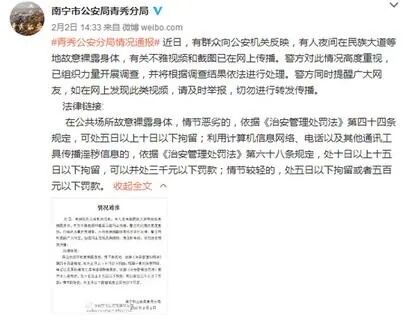2017年2月,一名容貌姣好的全裸女子大半夜在民族大道当街奔跑,还面带微笑拍下了裸露视频。该女子姓张,柳州人,在某所高校就读。警方根据规定,对在公共场所裸露身体的张某处以行政拘留5日。
