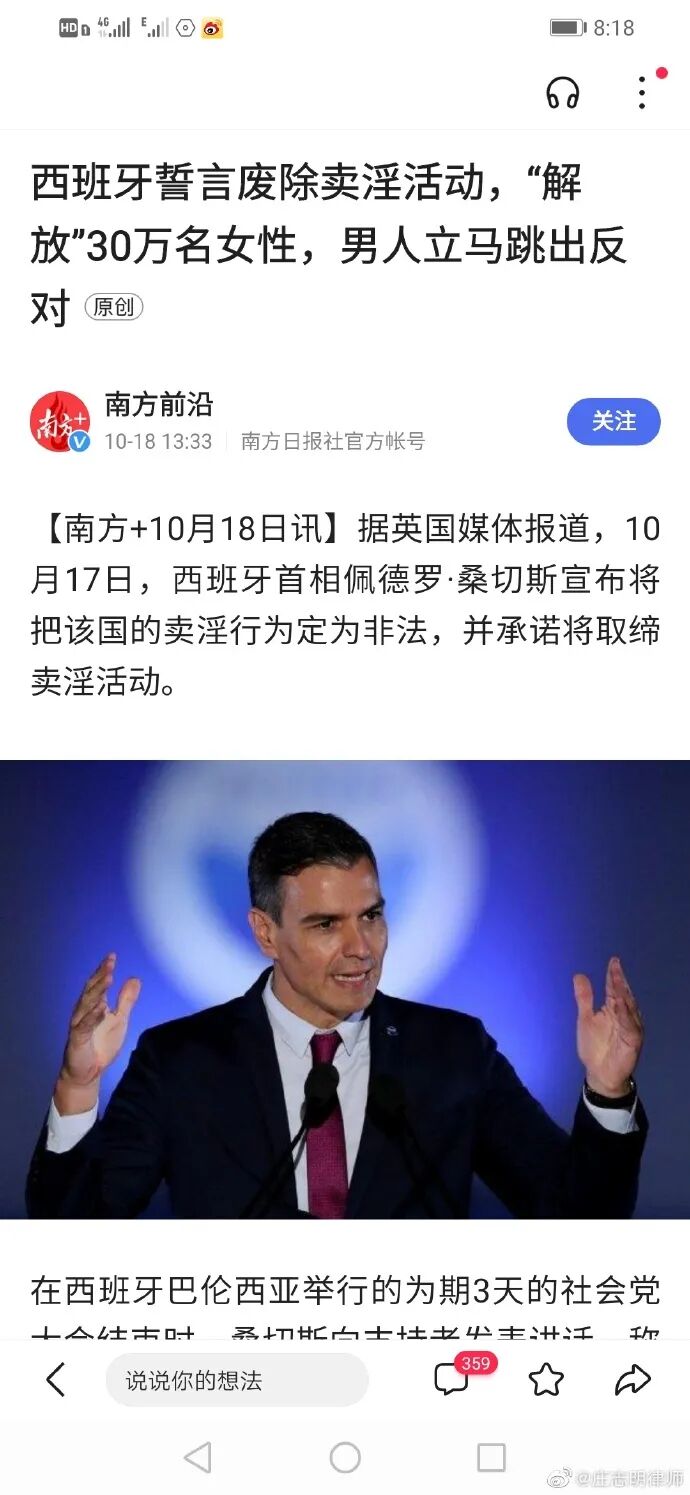 目前卖淫合法的西班牙政府正在推动卖淫非法。性交易古今中外的历史趋势是非法,而非合法,在法律层面上否定性交易,在道德层面上谴责性交易,才代表着历史的进步。