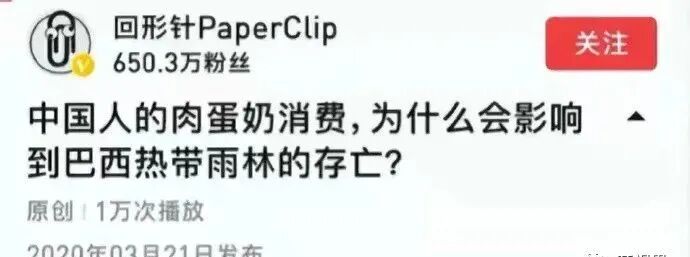当年3月,“回形针”就开始配合美国的宣传,肆意渲染、灌输是中国人吃肉造成了巴西亚马逊雨林的大火这一充满恶意的观点,还制作了一个名为“中国人的肉蛋奶消费,为什么会影响到巴西热带雨林的存亡”的视频,特别说一句“经典”:“在经济全球化时代,巴西的蝴蝶扇一下翅膀,未必会引发德克萨斯州的龙卷风。但我们的肉蛋奶消费却可以实实在在影响巴西森林的存亡。”