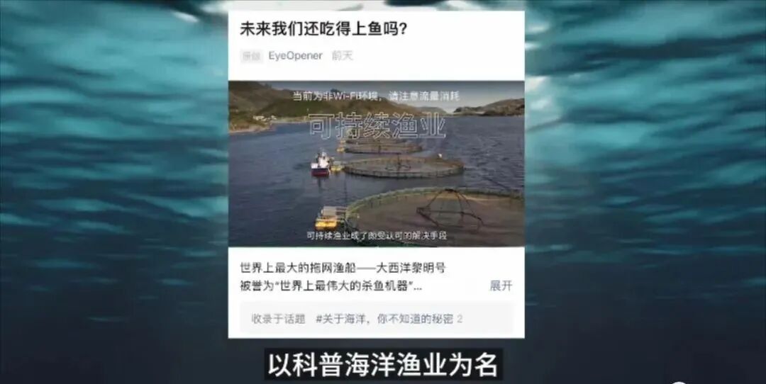 比如一个UP主@EyeOpener ,在其所制作的视频《未来我们还吃得上鱼吗?》、《生物多样性有什么用?》中,居然让蛋白质摄入量远低于发达国家人民的中国人,既不能吃肉,又不能吃蛋白,还不能吃海鲜。