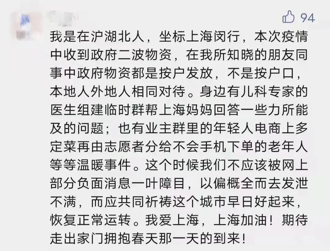 总的来说,尽管这次疫情还没有结束,但我们既看到了上海有很多纰漏的地方,也看到了不少人性光辉的闪现。