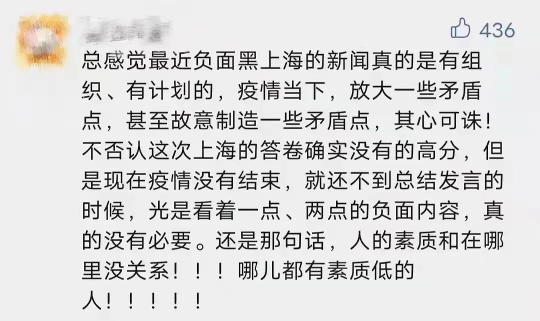但我注意上,目前网络上出现了很多对上海怀有恶意的评论,“所谓的优等生也不过如此”,“终究是一个排斥外地人的城市”,等等。这些评论不是在就事论事,而是在煽动和撕裂,更可怕的是,它不仅会抹黑大部分无辜的上海朋友,还会伤害那些在一线日夜奋战的抗疫人员。