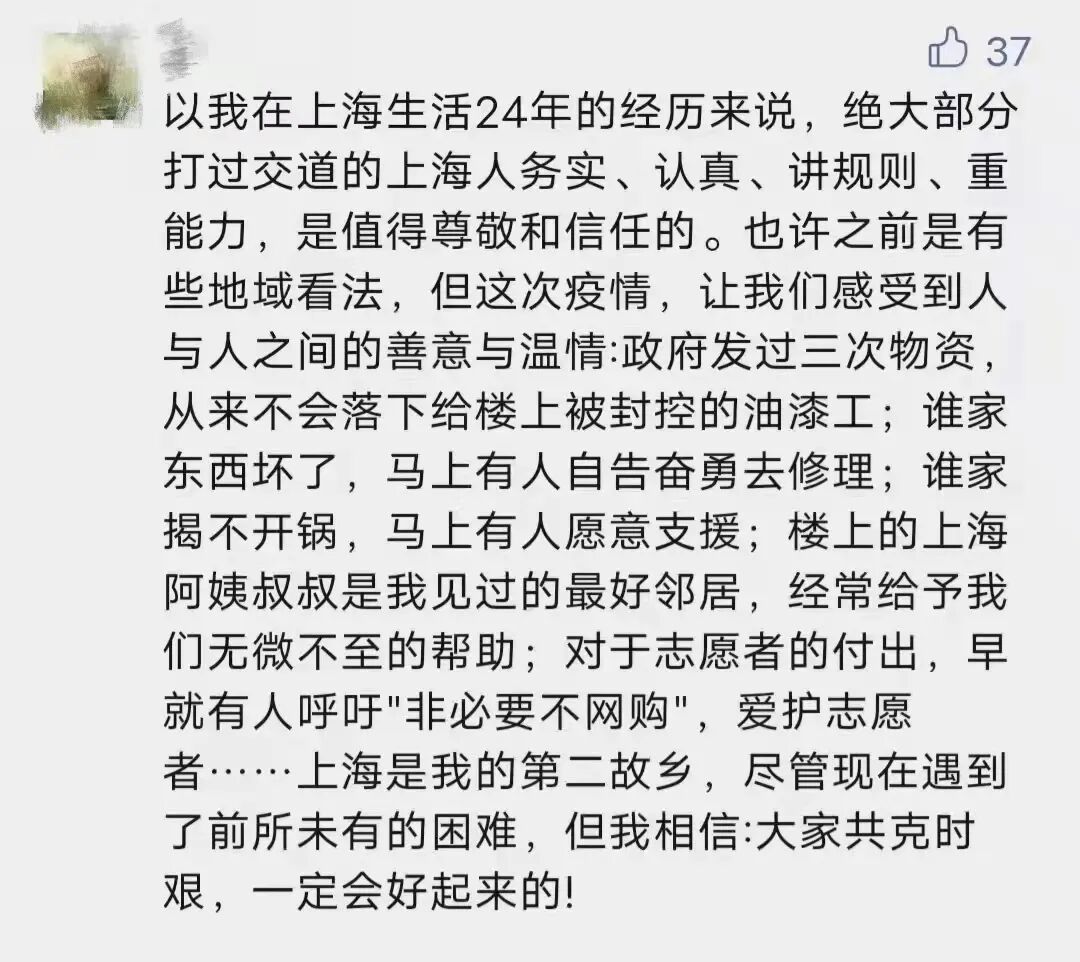 这次疫情,我也相信它会敲打掉上海身上的一些傲慢,这也未必不是一件好事。