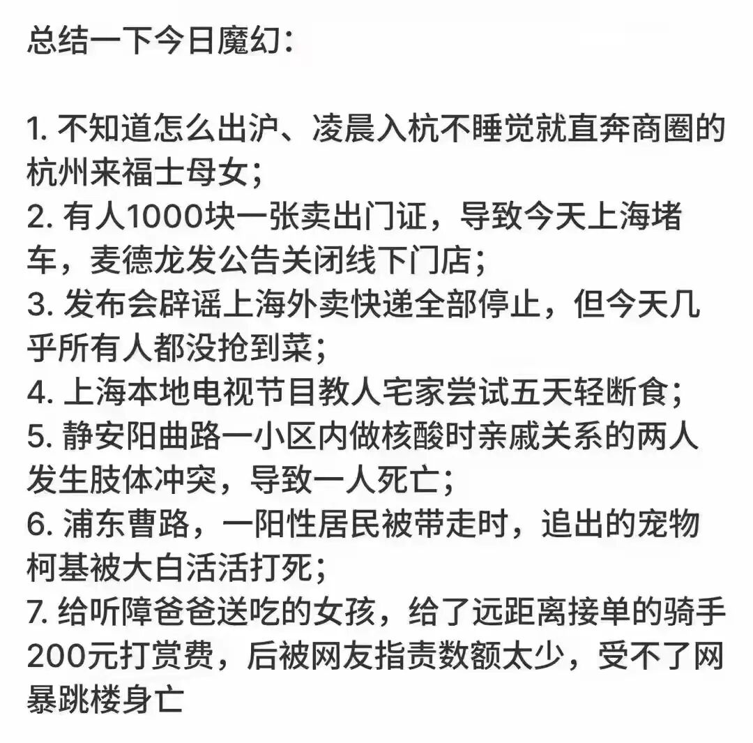 上海现在的确很难,也不太好出来说话。有些事情估计是真的,有的事情是待调查确认的,还有的事情压根是谣言,比如那个有人1000块卖出门证的,但是谣言往往比辟谣的通告传得更快,也更广。