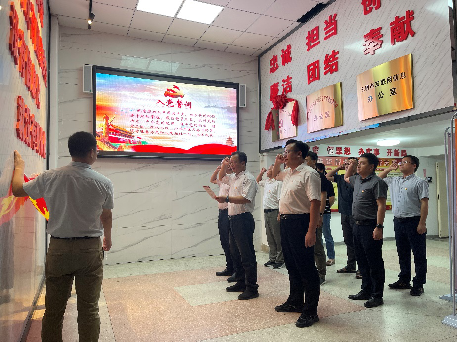 “我志愿加入中国共产党,拥护党的纲领,遵守党的章程……”面对鲜红的党旗,在三明市委宣传部副部长、市委网信办主任、市互联网信息办主任张建林的带领下,全办党员干部一起举起右拳,庄严宣誓。铿锵有力的宣誓声响彻全场,久久激荡在每位党员的心中。宣誓后,张建林为全办党员送上了党员政治生日贺卡并表示祝贺,切实增强党员的荣誉感、归属感和使命感。