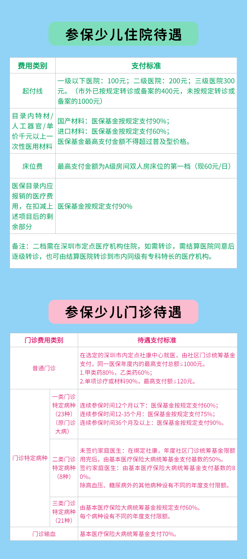 参保少儿(大学生)的医疗保险待遇、就医、转诊按《深圳市社会医疗保险办法》中二档医疗保险的规定执行。