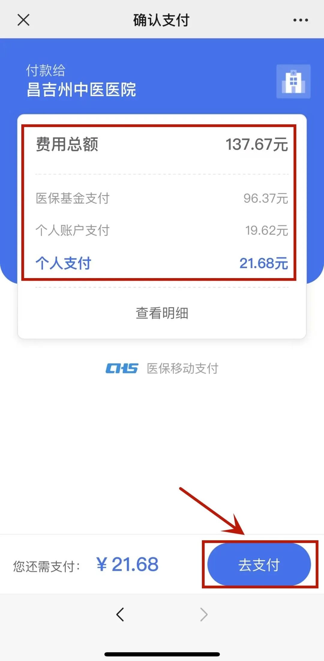 3.清单内会显示您的“费用总额”以及医保基金支付、个人账户支付、个人支付(自费部分)的具体金额,确认完毕后,点击【去支付】,点击【立即支付】后,我们将线上直接扣除医保支付部分并跳转至微信完成个人支付(自费)部分的结算;