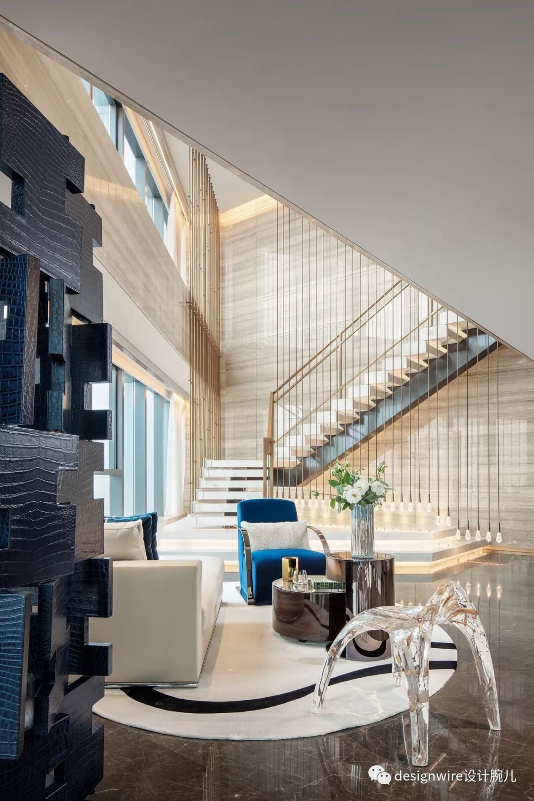 进入玄关,6.2米高的挑高空间,开阔的空中景观视野,由一道极具雕塑感的大理石楼梯所引导,衬着窗外澄净、一望无际的天空,似乎天地间在眼前、脚下无尽延伸。