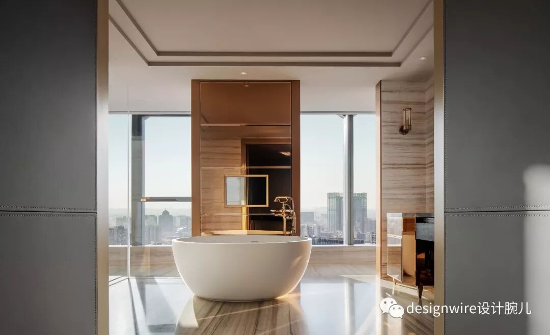 主卫延续大理石的铺贴与雕琢,自然光从淋浴房和浴缸区域倾斜而下,厚实的建筑体量感,与城市天际线遥相呼应将您带入无限遐想的天空之城。