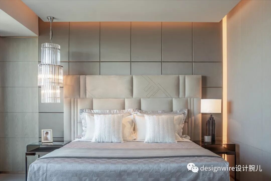 设计延续了源自永恒之城意大利FENDI的风格,米色的实木板和扪皮饰面为主卧带来温暖感。