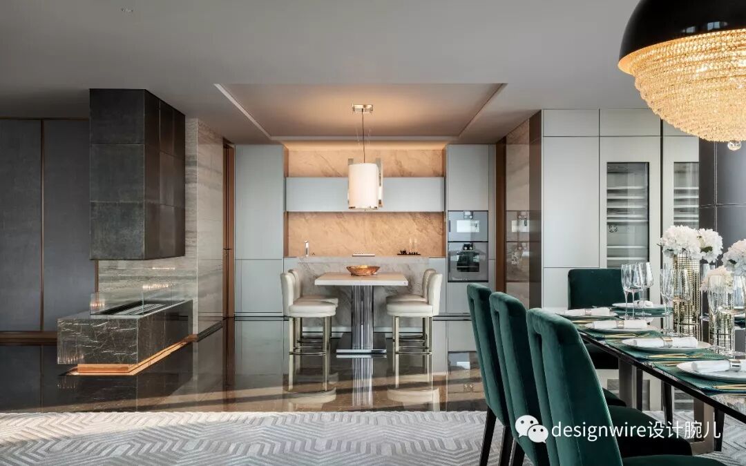 FENDI家具和造型夸张的水晶吊灯选型,与智能家居设计将奢华与实用功能之间无缝融合,为主人提供优雅舒适氛围,以及奢华和现代的精致触感。