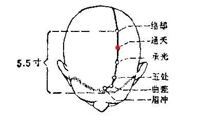 正坐或仰卧位,在通天后1.5寸,距督脉1.5寸处取穴。